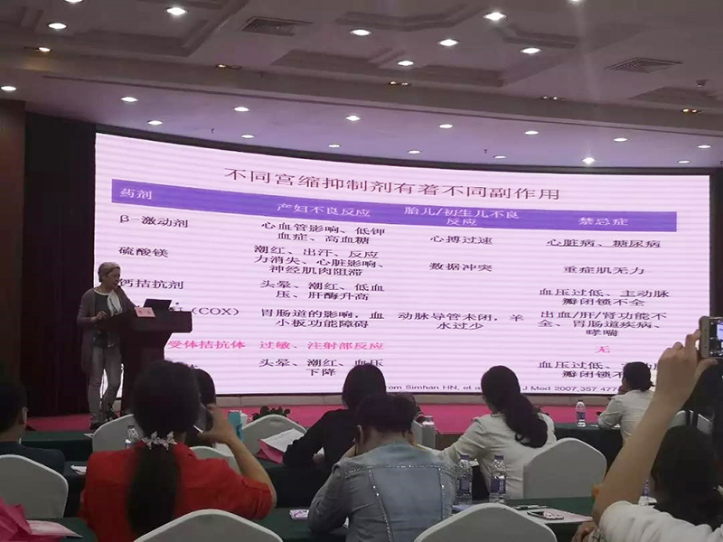 本次大會以產科危重癥為中心,邀請了諸多國內一線大咖講課。廣州三院產科陳敦金教授分享了瘢痕妊娠的診治進展。浙江省婦保賀晶教授分享了產科危重癥的圍手術期管理的同時,還分享了阿托西班在早產方面的治療,認為催產素受體拮抗劑阿托西班副作用小,效果明顯,優于β受體激動劑利托君。