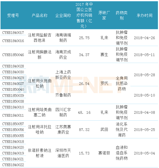 從治療類別看,14個品種中有5個為抗腫瘤和免疫調(diào)節(jié)劑,可見抗腫瘤領(lǐng)域是藥企們申報的重點(diǎn),消化系統(tǒng)及代謝、神經(jīng)系統(tǒng)藥物、全身抗感染藥物均有2個產(chǎn)品;從產(chǎn)品的申報廠家看,齊魯制藥及子公司申報的產(chǎn)品最多;從申報的產(chǎn)品看,除了注射用頭孢曲松鈉有2家企業(yè)同時申報外,其他品種均只有1家企業(yè)申報;從產(chǎn)品的銷售額看,2017年在公立醫(yī)療機(jī)構(gòu)終端銷售額超過10億元的產(chǎn)品有11個(超過20億元的有8個),其中注射用泮托拉唑鈉接近90億元,注射用培美曲塞二鈉及多西他賽注射液接近50億元。