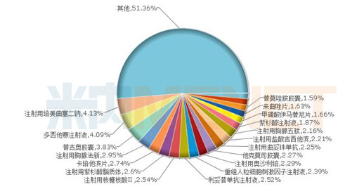 截至目前,申報一致性評價的抗腫瘤產(chǎn)品在2017年中國公立醫(yī)療機(jī)構(gòu)終端抗腫瘤和免疫調(diào)節(jié)劑的競爭格局中均處于主導(dǎo)地位,注射用培美曲塞二鈉以4.13%的比例位居首位,多西他賽注射液以4.09%的比例緊接其后,注射用胸腺法新以2.95%的比例排位第四。