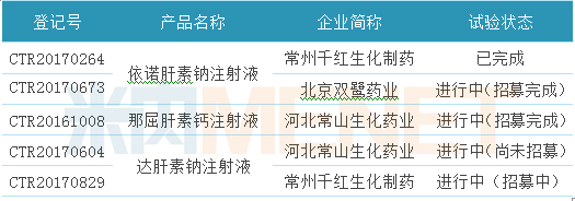 截至目前,一致性評價中準(zhǔn)備開展/已開展/已完成BE試驗的注射劑有5個登記號,涉及企業(yè)3家,品種3個。從進(jìn)行試驗的企業(yè)看,常州千紅生化藥業(yè)、河北常山生化藥業(yè)均有2個產(chǎn)品處于試驗階段;從試驗的產(chǎn)品看,有2家藥企進(jìn)行BE試驗的依諾肝素鈉注射液,深圳市天道醫(yī)藥已搶先一步,其產(chǎn)品已經(jīng)處于申報一致性評價的隊列。