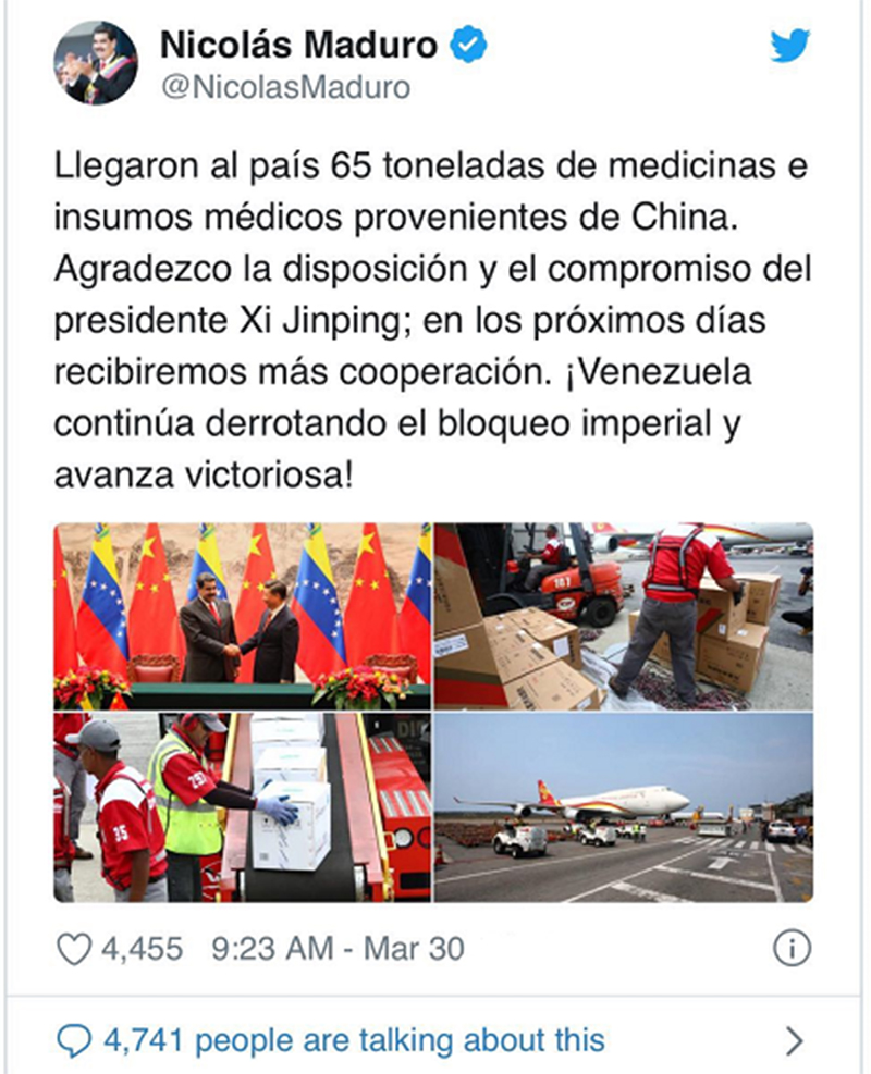 Venezuelan Foreign Minister Areasa, Minister of Health Alvarado, Minister of Economy and Finance Serpa and Chinese Ambassador to Venezuela Li Baorong went to the airport to welcome the experts and supplies. Venezuelan President Maduro said in a televised speech and on his personal Twitter account that "this is real humanitarian assistance, I thank the Chinese government and people for their support to the people of Venezuela."