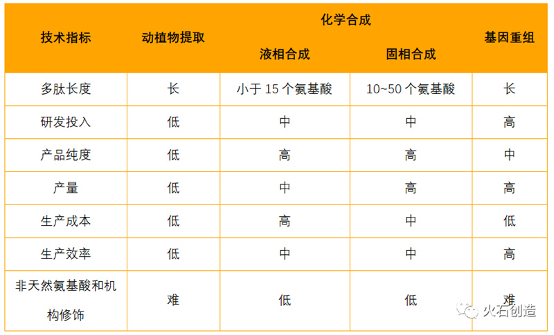 1.從動植物中提取,是先用物理、化學技術對動植物組織進行初步處理,然后經過酶解或其他消解技術降解蛋白前體,最后利用溶劑將多肽進行提取。但由于動植物體內活性多肽物質含量很低,提取純度較低,且存在潛在的生物安全風險,限制了在臨床上的應用,技術正逐漸被淘汰。