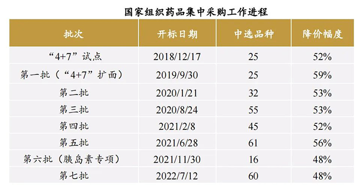 從2018年國家醫(yī)保局成立為起點,截至 2022 年第二季度末,我國國家組織藥品集中采購已開展近5年。5年間,涉及7 批國家組織藥品集中采購,覆蓋 294 種藥品,按集采前價格測算,涉及金額約占公立醫(yī)療機構(gòu)化學(xué)藥、生物藥年采購額的 35%,一大批常見藥、慢病藥、抗癌藥價格大幅降低,平均降幅 53%。