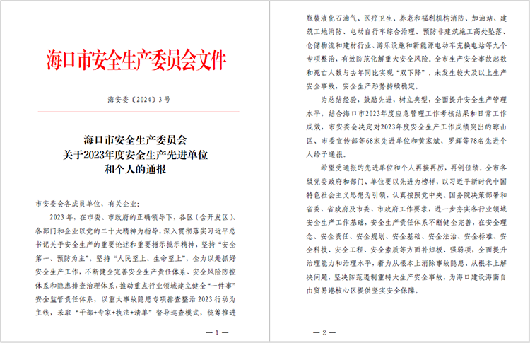 喜報!公司獲評海口市安全生產委員會2023年度安全生產先進單位