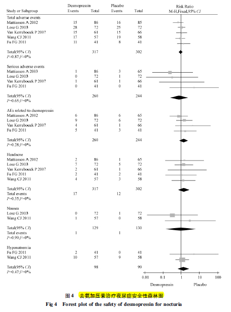 5 個納入Meta 分析的RCT 顯示,去氨加壓素組和對照劑組產生的總的不良反應次數和嚴重不良反應的次數比較,差異無統計學意義( 分別為P = 0. 87、P = 0. 65) 。涉及最常見的不良反應如頭痛、惡心、低血鈉等,2組比較,差異也無統計學意義( 分別為P = 0. 36、P = 0. 99、P = 0. 47)。