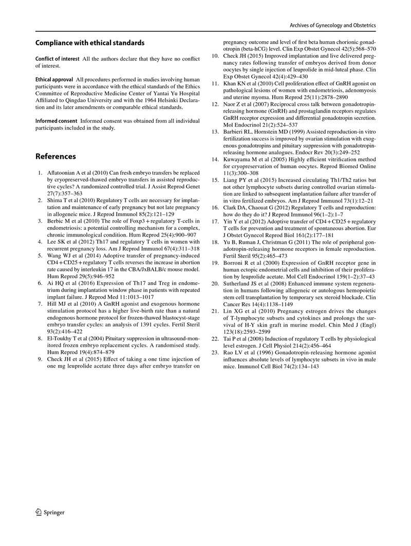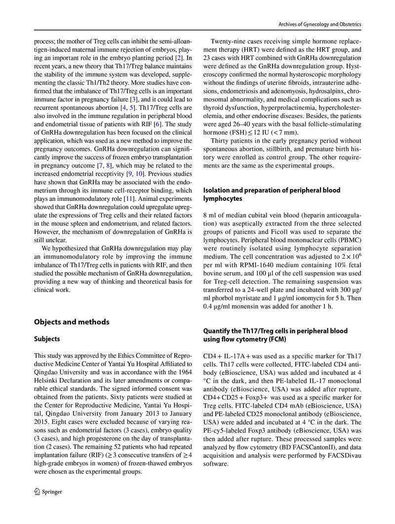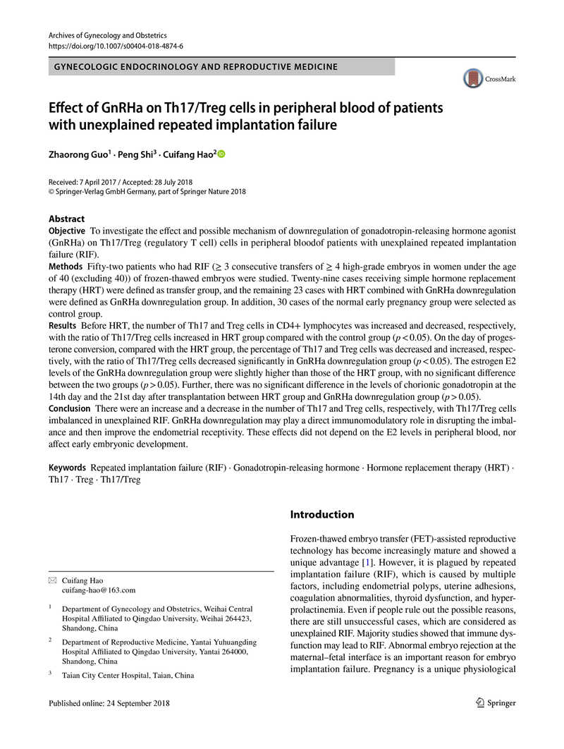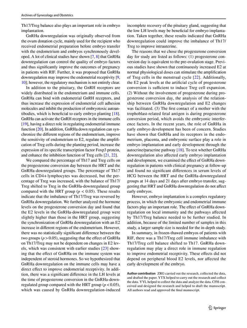 結(jié)論:在不明原因的RIF患者中,Th17和Treg細(xì)胞數(shù)量分別增加和減少,Th17 / Treg細(xì)胞比值失衡。GnRHa降調(diào)可能通過(guò)阻斷Th17/Treg細(xì)胞比值失衡發(fā)揮免疫調(diào)節(jié)作用從而提高子宮內(nèi)膜容受性。這些作用不依賴于外周血中的E2水平,也不影響早期胚胎發(fā)育。