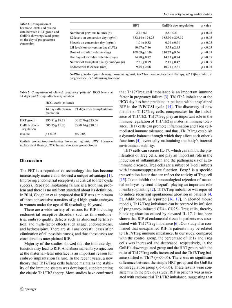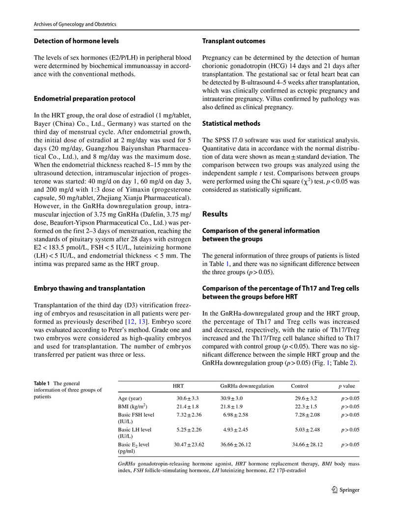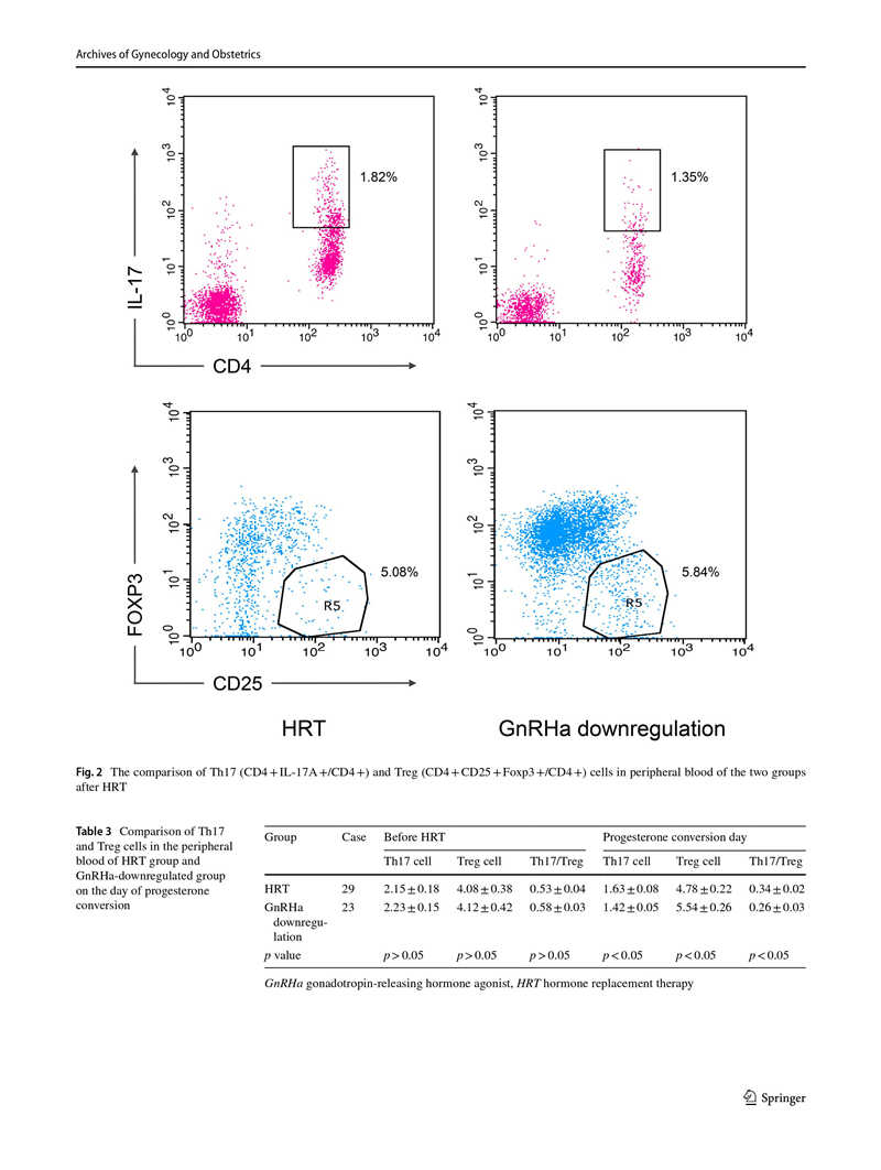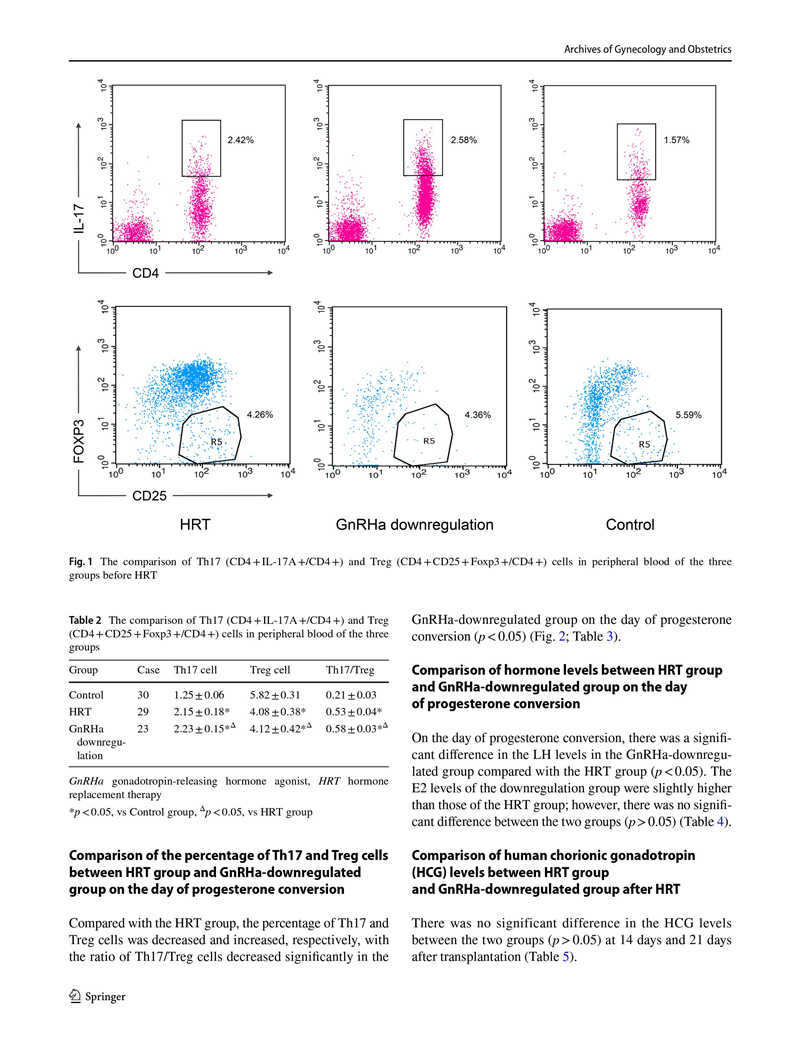 結(jié)果:HRT前,HRT組與對(duì)照組相比,CD4+淋巴細(xì)胞中的Th17和Treg細(xì)胞數(shù)量分別增加和減少,Th17 / Treg細(xì)胞比值升高(p<0.05)。在孕酮轉(zhuǎn)化當(dāng)天,與HRT組相比,GnRHa降調(diào)組的Th17和Treg細(xì)胞百分比分別降低和升高,Th17 / Treg細(xì)胞比值顯著降低(p<0.05)。GnRHa降調(diào)組的雌激素(E2)水平略高于HRT組,兩組間差異無(wú)統(tǒng)計(jì)學(xué)意義(p> 0.05)。此外,HRT組和GnRHa降調(diào)組在移植后第14天和第21天的絨毛膜促性腺激素水平?jīng)]有顯著差異(p>0.05)。