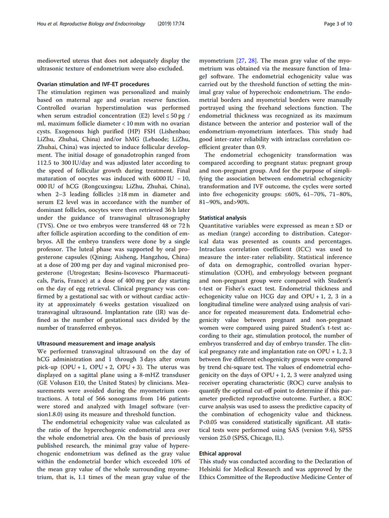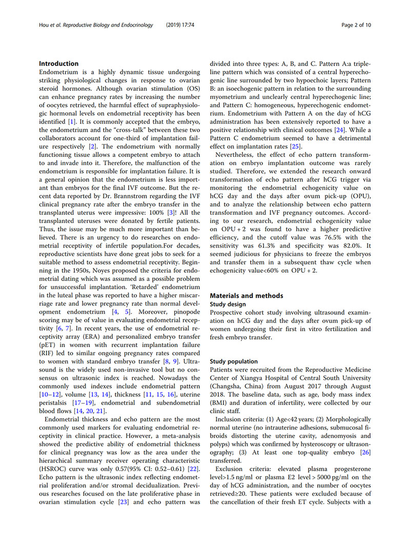 背景:非侵入性測量子宮內(nèi)膜容受性的方法很有價(jià)值,因?yàn)樗锌赡芨纳企w外受精(IVF)結(jié)局。有人認(rèn)為hCG給藥當(dāng)天的子宮內(nèi)膜回聲是子宮內(nèi)膜容受性的良好標(biāo)志。在日常實(shí)踐中,我們注意到胚胎移植日子宮內(nèi)膜非均質(zhì)高回聲的患者通常妊娠率較低。因此,我們將延伸擴(kuò)展了hCG觸發(fā)后子宮內(nèi)膜回聲模式轉(zhuǎn)化的研究,以分析子宮內(nèi)膜回聲改變與IVF結(jié)局之間的關(guān)系。