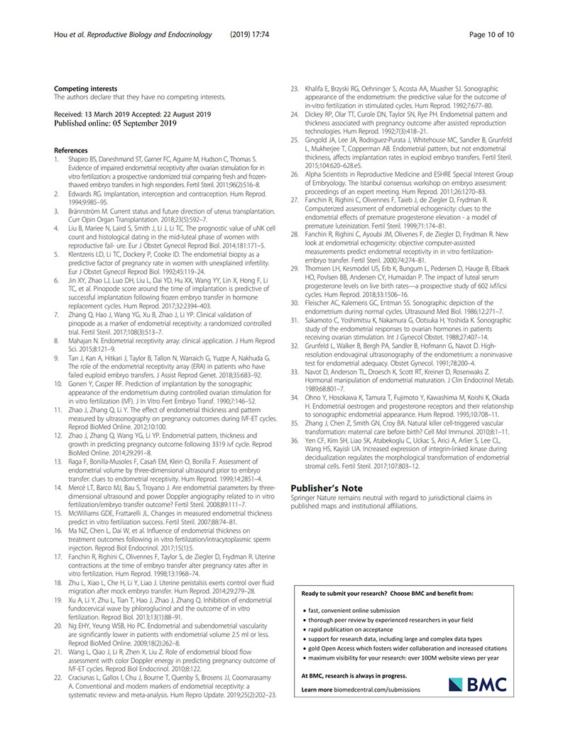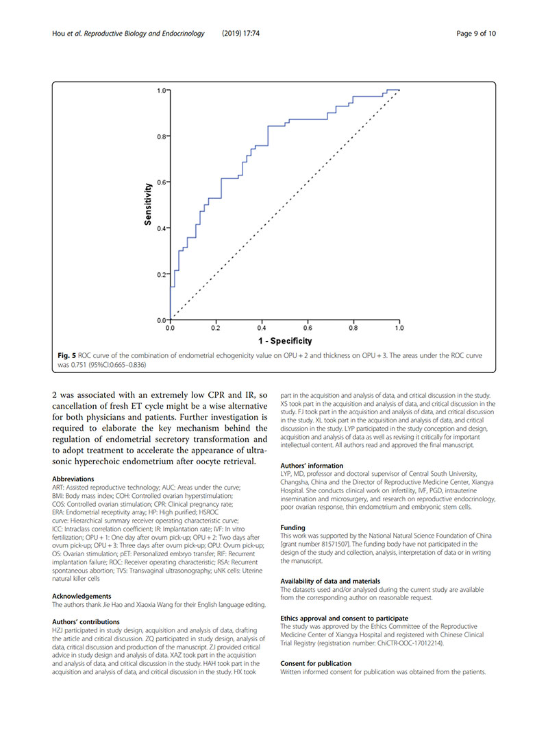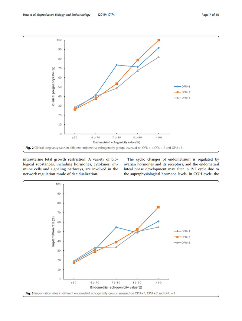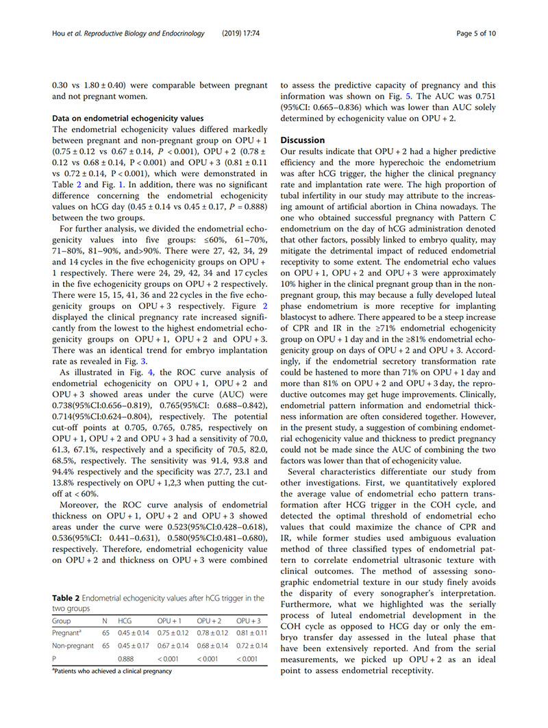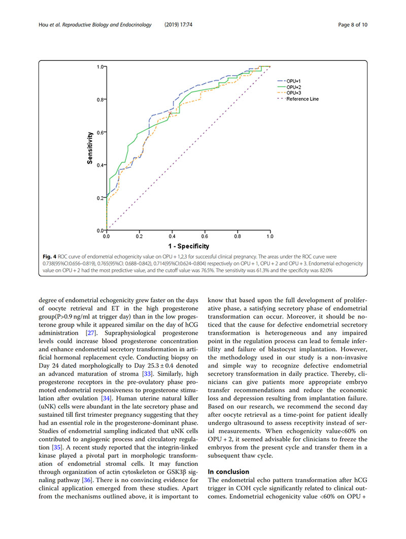 結(jié)論:建議用取卵后第2天(OPU+2)的子宮內(nèi)膜回聲值評價(jià)子宮內(nèi)膜容受性。當(dāng)OPU+2的回聲值<60%時(shí),臨床醫(yī)生似乎適合提供“全冷凍”IVF周期,并在隨后的凍融胚胎周期中進(jìn)行移植。